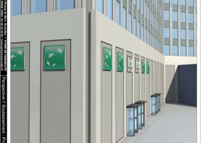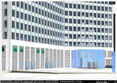 En conséquence, il nous a paru nécessaire de greffer sur l’entrée de la tour un volume d’ampleur suffisante (ici de double hauteur) capable d’interagir avec l’espace public.