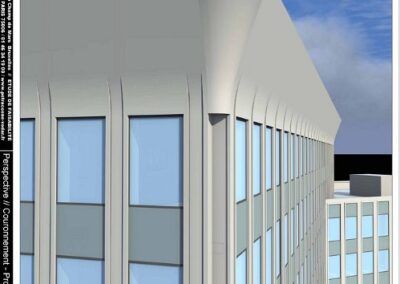 Pour affirmer l’effet d’élancement et le caractère de matrice du monolithe que représente ce nouveau socle, les quatre angles du volume de la tour ont été revêtus de Ductal : du socle d’origine, ils rejoignent le sommet de la tour pour devenir couronnement dans le respect de la configuration géométrique existante qui présente une inclinaison de vingt degrés par rapport à la verticale.